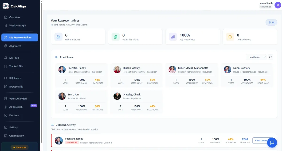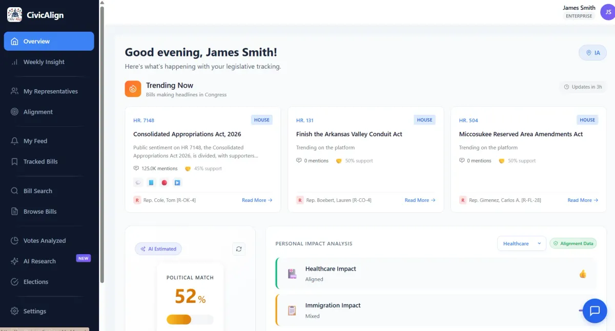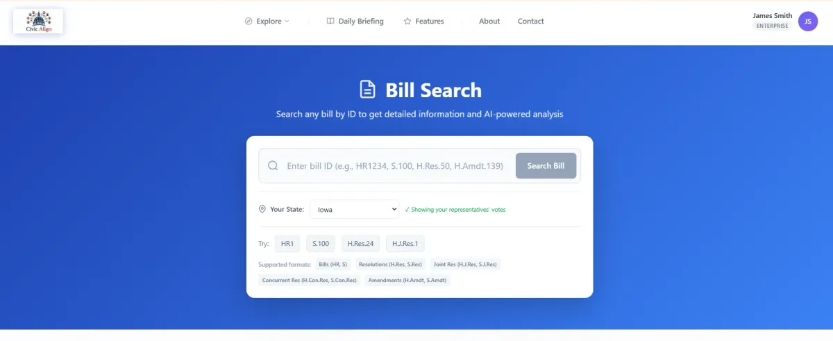 CivicAlign translates complex legislation into plain English, tracks your representatives, and delivers personalized briefings—professional-grade intelligence for every citizen.
